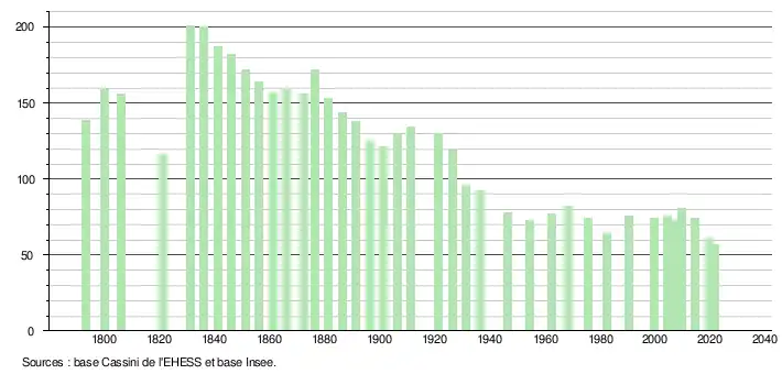 L'évolution du nombre d'habitants est connue à travers les recensements de la population effectués dans la commune depuis 1793. Pour les communes de moins de 10 000 habitants, une enquête de recensement portant sur toute la population est réalisée tous les cinq ans, les populations légales des années intermédiaires étant quant à elles estimées par interpolation ou extrapolation[46]. Pour la commune, le premier recensement exhaustif entrant dans le cadre du nouveau dispositif a été réalisé en 2004[47].