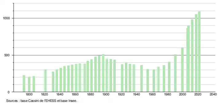 L'évolution du nombre d'habitants est connue à travers les recensements de la population effectués dans la commune depuis 1793. Pour les communes de moins de 10 000 habitants, une enquête de recensement portant sur toute la population est réalisée tous les cinq ans, les populations légales des années intermédiaires étant quant à elles estimées par interpolation ou extrapolation[15]. Pour la commune, le premier recensement exhaustif entrant dans le cadre du nouveau dispositif a été réalisé en 2007[16].