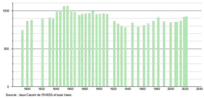 L'évolution du nombre d'habitants est connue à travers les recensements de la population effectués dans la commune depuis 1793. Pour les communes de moins de 10 000 habitants, une enquête de recensement portant sur toute la population est réalisée tous les cinq ans, les populations légales des années intermédiaires étant quant à elles estimées par interpolation ou extrapolation[27]. Pour la commune, le premier recensement exhaustif entrant dans le cadre du nouveau dispositif a été réalisé en 2008[28].