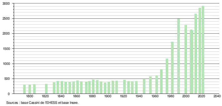 L'évolution du nombre d'habitants est connue à travers les recensements de la population effectués dans la commune depuis 1793. Pour les communes de moins de 10 000 habitants, une enquête de recensement portant sur toute la population est réalisée tous les cinq ans, les populations légales des années intermédiaires étant quant à elles estimées par interpolation ou extrapolation[32]. Pour la commune, le premier recensement exhaustif entrant dans le cadre du nouveau dispositif a été réalisé en 2007[33].
