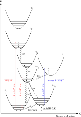 Le fer est le métal présentant le plus couramment un effet de croisement de spin, le premier exemple connu étant le complexe tris(dithiocarbamato)fer(III)[4]. L'effet LIESST se manifeste pour les complexes de fer par excitation sous l'effet d'une lumière verte d'un état bas spin vers un état triplet. Deux étapes successives de conversion intersystème aboutissent à l'état haut spin. Le retour de l'état haut spin vers l'état bas spin requiert l'application d'une lumière rouge[1].