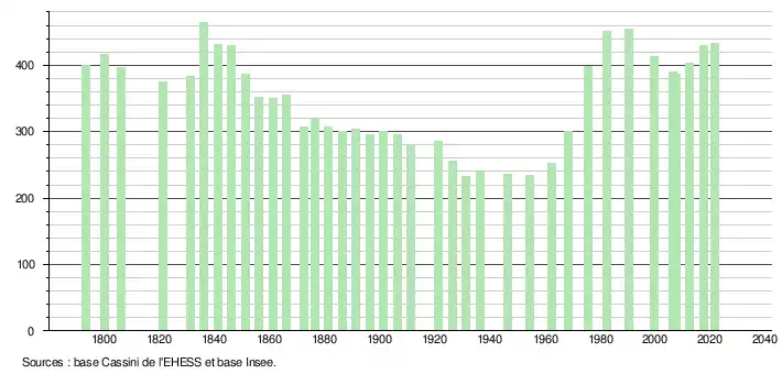 L'évolution du nombre d'habitants est connue à travers les recensements de la population effectués dans la commune depuis 1793. Pour les communes de moins de 10 000 habitants, une enquête de recensement portant sur toute la population est réalisée tous les cinq ans, les populations légales des années intermédiaires étant quant à elles estimées par interpolation ou extrapolation[38]. Pour la commune, le premier recensement exhaustif entrant dans le cadre du nouveau dispositif a été réalisé en 2007[39].