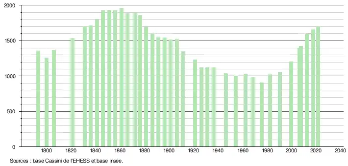 L'évolution du nombre d'habitants est connue à travers les recensements de la population effectués dans la commune depuis 1793. Pour les communes de moins de 10 000 habitants, une enquête de recensement portant sur toute la population est réalisée tous les cinq ans, les populations légales des années intermédiaires étant quant à elles estimées par interpolation ou extrapolation[24]. Pour la commune, le premier recensement exhaustif entrant dans le cadre du nouveau dispositif a été réalisé en 2007[25].