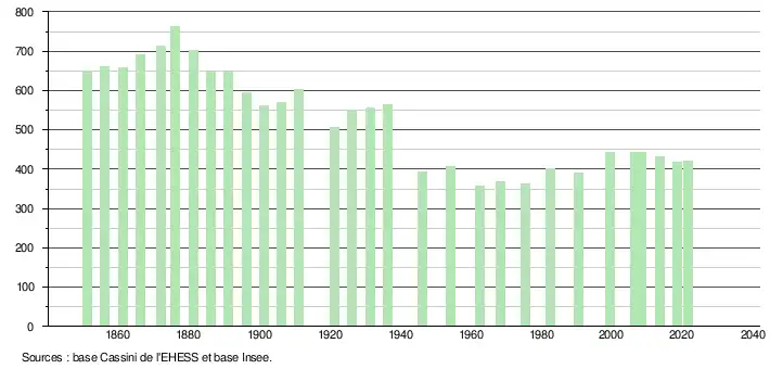 L'évolution du nombre d'habitants est connue à travers les recensements de la population effectués dans la commune depuis 1851. Pour les communes de moins de 10 000 habitants, une enquête de recensement portant sur toute la population est réalisée tous les cinq ans, les populations légales des années intermédiaires étant quant à elles estimées par interpolation ou extrapolation[17]. Pour la commune, le premier recensement exhaustif entrant dans le cadre du nouveau dispositif a été réalisé en 2008[18].
