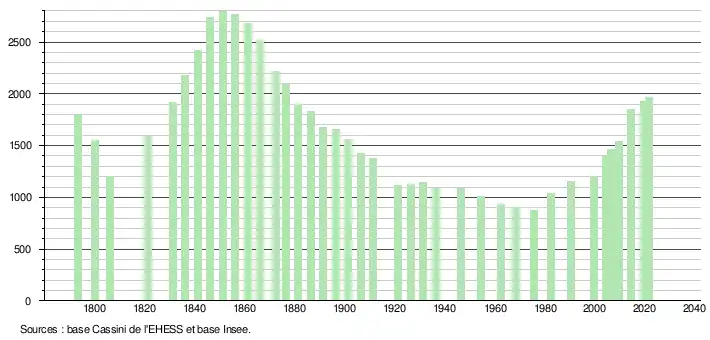 L'évolution du nombre d'habitants est connue à travers les recensements de la population effectués dans la commune depuis 1793. Pour les communes de moins de 10 000 habitants, une enquête de recensement portant sur toute la population est réalisée tous les cinq ans, les populations légales des années intermédiaires étant quant à elles estimées par interpolation ou extrapolation[37]. Pour la commune, le premier recensement exhaustif entrant dans le cadre du nouveau dispositif a été réalisé en 2004[38].