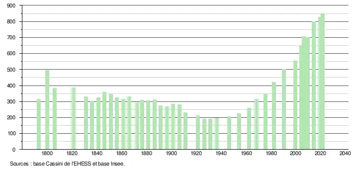 L'évolution du nombre d'habitants est connue à travers les recensements de la population effectués dans la commune depuis 1793. Pour les communes de moins de 10 000 habitants, une enquête de recensement portant sur toute la population est réalisée tous les cinq ans, les populations légales des années intermédiaires étant quant à elles estimées par interpolation ou extrapolation[24]. Pour la commune, le premier recensement exhaustif entrant dans le cadre du nouveau dispositif a été réalisé en 2004[25].