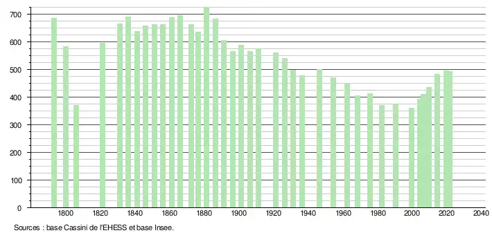 L'évolution du nombre d'habitants est connue à travers les recensements de la population effectués dans la commune depuis 1793. Pour les communes de moins de 10 000 habitants, une enquête de recensement portant sur toute la population est réalisée tous les cinq ans, les populations légales des années intermédiaires étant quant à elles estimées par interpolation ou extrapolation[22]. Pour la commune, le premier recensement exhaustif entrant dans le cadre du nouveau dispositif a été réalisé en 2004[23].