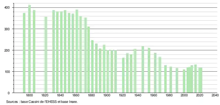 L'évolution du nombre d'habitants est connue à travers les recensements de la population effectués dans la commune depuis 1793. Pour les communes de moins de 10 000 habitants, une enquête de recensement portant sur toute la population est réalisée tous les cinq ans, les populations légales des années intermédiaires étant quant à elles estimées par interpolation ou extrapolation[26]. Pour la commune, le premier recensement exhaustif entrant dans le cadre du nouveau dispositif a été réalisé en 2004[27].