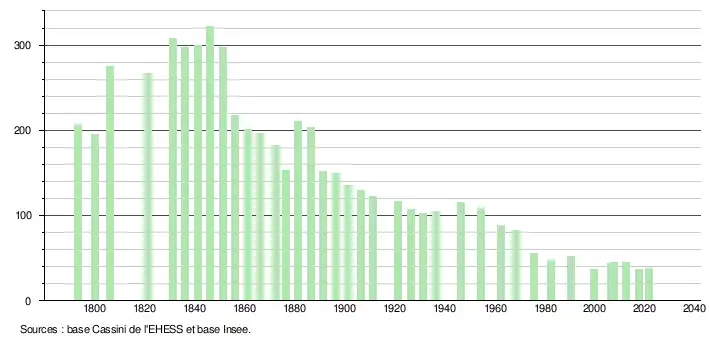 L'évolution du nombre d'habitants est connue à travers les recensements de la population effectués dans la commune depuis 1793. Pour les communes de moins de 10 000 habitants, une enquête de recensement portant sur toute la population est réalisée tous les cinq ans, les populations légales des années intermédiaires étant quant à elles estimées par interpolation ou extrapolation[18]. Pour la commune, le premier recensement exhaustif entrant dans le cadre du nouveau dispositif a été réalisé en 2007[19].