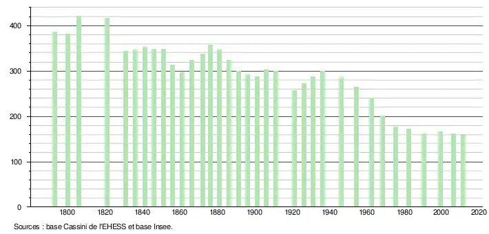 L'évolution du nombre d'habitants est connue à travers les recensements de la population effectués dans la commune depuis 1793. À partir du , les populations légales des communes sont publiées annuellement dans le cadre d'un recensement qui repose désormais sur une collecte d'information annuelle, concernant successivement tous les territoires communaux au cours d'une période de cinq ans. Pour les communes de moins de 10 000 habitants, une enquête de recensement portant sur toute la population est réalisée tous les cinq ans, les populations légales des années intermédiaires étant quant à elles estimées par interpolation ou extrapolation[10]. Pour la commune, le premier recensement exhaustif entrant dans le cadre du nouveau dispositif a été réalisé en 2006[11],[Note 2].