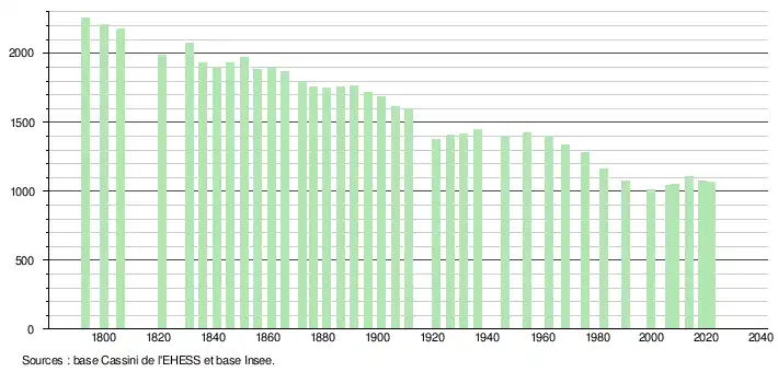 L'évolution du nombre d'habitants est connue à travers les recensements de la population effectués dans la commune depuis 1793. Pour les communes de moins de 10 000 habitants, une enquête de recensement portant sur toute la population est réalisée tous les cinq ans, les populations légales des années intermédiaires étant quant à elles estimées par interpolation ou extrapolation[24]. Pour la commune, le premier recensement exhaustif entrant dans le cadre du nouveau dispositif a été réalisé en 2008[25].