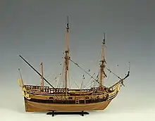 Expédition de Robert Cavelier de La Salle à la Louisiane en 1684, peint en 1844 par Théodore Gudin. La Belle est sur la gauche, Le Joly au centre et L'Aimable est échoué à droite. | |