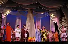 - Le final de l'acte I, "L'homme à la pomme/ Au ciel" est une parodie de l'air d'Urbain de l'opéra des Huguenots du compositeur Meyerbeer né en Saxe, tout comme l'air des deux Ajax et leur double thorax[52]. Meyerbeer appréciait l'humour d'Offenbach.