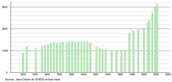 L'évolution du nombre d'habitants est connue à travers les recensements de la population effectués dans la commune depuis 1800. Pour les communes de moins de 10 000 habitants, une enquête de recensement portant sur toute la population est réalisée tous les cinq ans, les populations légales des années intermédiaires étant quant à elles estimées par interpolation ou extrapolation[26]. Pour la commune, le premier recensement exhaustif entrant dans le cadre du nouveau dispositif a été réalisé en 2008[27].