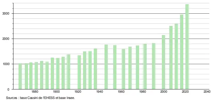 L'évolution du nombre d'habitants est connue à travers les recensements de la population effectués dans la commune depuis 1866. Pour les communes de moins de 10 000 habitants, une enquête de recensement portant sur toute la population est réalisée tous les cinq ans, les populations légales des années intermédiaires étant quant à elles estimées par interpolation ou extrapolation[31]. Pour la commune, le premier recensement exhaustif entrant dans le cadre du nouveau dispositif a été réalisé en 2006[32].