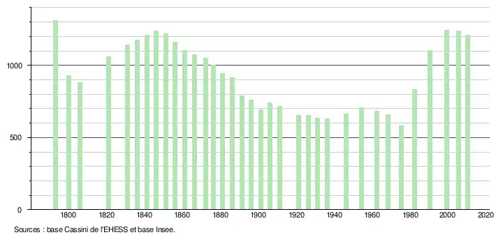 L'évolution du nombre d'habitants est connue à travers les recensements de la population effectués dans la commune depuis 1793. À partir du , les populations légales des communes sont publiées annuellement dans le cadre d'un recensement qui repose désormais sur une collecte d'information annuelle, concernant successivement tous les territoires communaux au cours d'une période de cinq ans. Pour les communes de moins de 10 000 habitants, une enquête de recensement portant sur toute la population est réalisée tous les cinq ans, les populations légales des années intermédiaires étant quant à elles estimées par interpolation ou extrapolation[17]. Pour la commune, le premier recensement exhaustif entrant dans le cadre du nouveau dispositif a été réalisé en 2005[18],[Note 2].