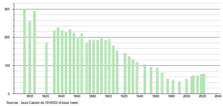 L'évolution du nombre d'habitants est connue à travers les recensements de la population effectués dans la commune depuis 1793. Pour les communes de moins de 10 000 habitants, une enquête de recensement portant sur toute la population est réalisée tous les cinq ans, les populations légales des années intermédiaires étant quant à elles estimées par interpolation ou extrapolation[15]. Pour la commune, le premier recensement exhaustif entrant dans le cadre du nouveau dispositif a été réalisé en 2008[16].