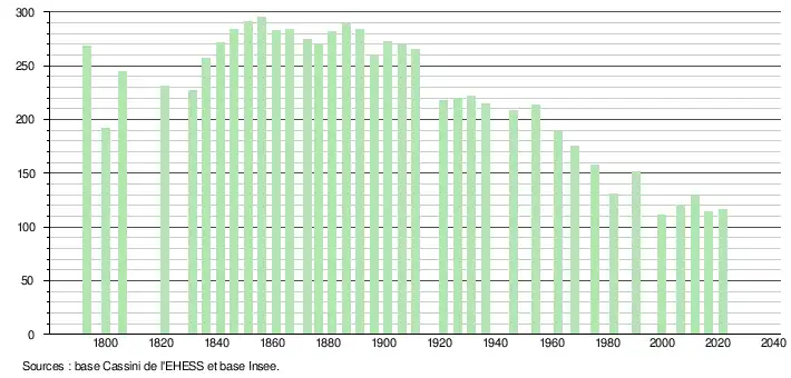 L'évolution du nombre d'habitants est connue à travers les recensements de la population effectués dans la commune depuis 1793. Pour les communes de moins de 10 000 habitants, une enquête de recensement portant sur toute la population est réalisée tous les cinq ans, les populations légales des années intermédiaires étant quant à elles estimées par interpolation ou extrapolation[15]. Pour la commune, le premier recensement exhaustif entrant dans le cadre du nouveau dispositif a été réalisé en 2006[16].