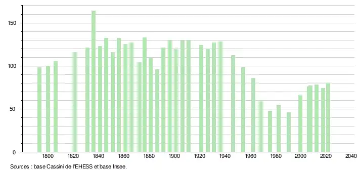 L'évolution du nombre d'habitants est connue à travers les recensements de la population effectués dans la commune depuis 1793. Pour les communes de moins de 10 000 habitants, une enquête de recensement portant sur toute la population est réalisée tous les cinq ans, les populations légales des années intermédiaires étant quant à elles estimées par interpolation ou extrapolation[17]. Pour la commune, le premier recensement exhaustif entrant dans le cadre du nouveau dispositif a été réalisé en 2007[18].