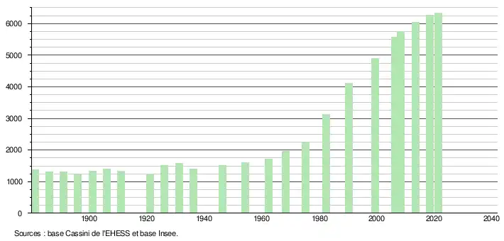 L'évolution du nombre d'habitants est connue à travers les recensements de la population effectués dans la commune depuis 1881. Pour les communes de moins de 10 000 habitants, une enquête de recensement portant sur toute la population est réalisée tous les cinq ans, les populations légales des années intermédiaires étant quant à elles estimées par interpolation ou extrapolation[24]. Pour la commune, le premier recensement exhaustif entrant dans le cadre du nouveau dispositif a été réalisé en 2008[25].