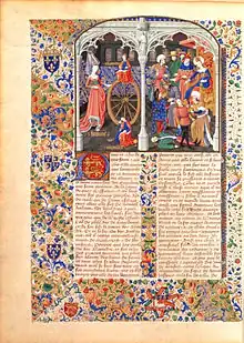 Douze copies de La Bouquechadière ont été enluminées par le maître de l'Échevinage de Rouen. Les écus et les signes héraldiques présents dans les quatre miniatures permettent de dater la plus ancienne de ces copies enluminées entre 1457 et 1461, ce qui en ferait l'un des travaux les plus anciens du maître[1]. Les miniatures sont présentes aux folios 1, 98, 159 et 280v°.