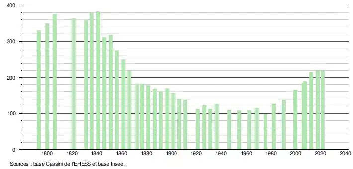 L'évolution du nombre d'habitants est connue à travers les recensements de la population effectués dans la commune depuis 1793. Pour les communes de moins de 10 000 habitants, une enquête de recensement portant sur toute la population est réalisée tous les cinq ans, les populations légales des années intermédiaires étant quant à elles estimées par interpolation ou extrapolation[15]. Pour la commune, le premier recensement exhaustif entrant dans le cadre du nouveau dispositif a été réalisé en 2007[16].