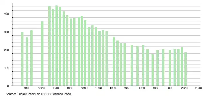 L'évolution du nombre d'habitants est connue à travers les recensements de la population effectués dans la commune depuis 1793. Pour les communes de moins de 10 000 habitants, une enquête de recensement portant sur toute la population est réalisée tous les cinq ans, les populations légales des années intermédiaires étant quant à elles estimées par interpolation ou extrapolation[30]. Pour la commune, le premier recensement exhaustif entrant dans le cadre du nouveau dispositif a été réalisé en 2006[31].