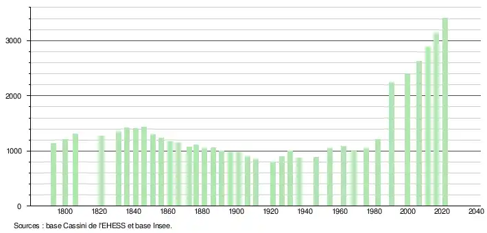 L'évolution du nombre d'habitants est connue à travers les recensements de la population effectués dans la commune depuis 1793. Pour les communes de moins de 10 000 habitants, une enquête de recensement portant sur toute la population est réalisée tous les cinq ans, les populations légales des années intermédiaires étant quant à elles estimées par interpolation ou extrapolation[31]. Pour la commune, le premier recensement exhaustif entrant dans le cadre du nouveau dispositif a été réalisé en 2006[32].