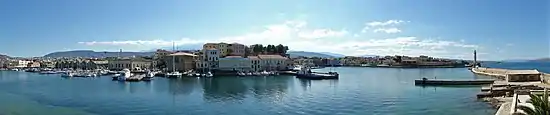 Souda, à 7 km à l’est, est le port de la ville et le lieu d’une base navale de l’OTAN. La ville est reliée quotidiennement au Pirée (Athènes) par des liaisons régulières en ferry assurées par les compagnies ANEK Lines, Minoan Lines et Blue Star Ferries.