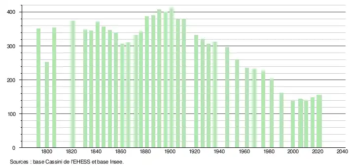 L'évolution du nombre d'habitants est connue à travers les recensements de la population effectués dans la commune depuis 1793. Pour les communes de moins de 10 000 habitants, une enquête de recensement portant sur toute la population est réalisée tous les cinq ans, les populations légales des années intermédiaires étant quant à elles estimées par interpolation ou extrapolation[31]. Pour la commune, le premier recensement exhaustif entrant dans le cadre du nouveau dispositif a été réalisé en 2005[32].