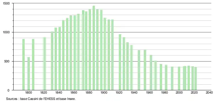 L'évolution du nombre d'habitants est connue à travers les recensements de la population effectués dans la commune depuis 1793. Pour les communes de moins de 10 000 habitants, une enquête de recensement portant sur toute la population est réalisée tous les cinq ans, les populations légales des années intermédiaires étant quant à elles estimées par interpolation ou extrapolation[20]. Pour la commune, le premier recensement exhaustif entrant dans le cadre du nouveau dispositif a été réalisé en 2007[21].