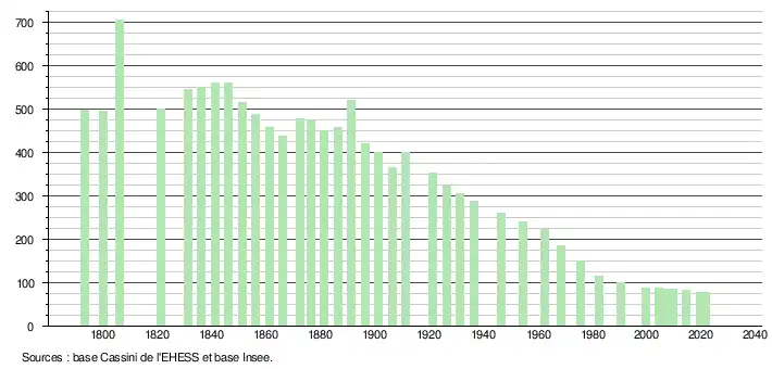 L'évolution du nombre d'habitants est connue à travers les recensements de la population effectués dans la commune depuis 1793. Pour les communes de moins de 10 000 habitants, une enquête de recensement portant sur toute la population est réalisée tous les cinq ans, les populations légales des années intermédiaires étant quant à elles estimées par interpolation ou extrapolation[23]. Pour la commune, le premier recensement exhaustif entrant dans le cadre du nouveau dispositif a été réalisé en 2004[24].