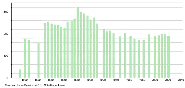 L'évolution du nombre d'habitants est connue à travers les recensements de la population effectués dans la commune depuis 1793. Pour les communes de moins de 10 000 habitants, une enquête de recensement portant sur toute la population est réalisée tous les cinq ans, les populations légales des années intermédiaires étant quant à elles estimées par interpolation ou extrapolation[17]. Pour la commune, le premier recensement exhaustif entrant dans le cadre du nouveau dispositif a été réalisé en 2005[18].