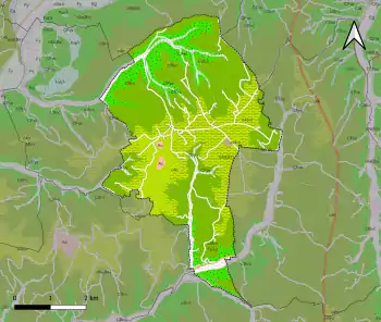 L'occupation des sols de la commune, telle qu'elle ressort de la base de données européenne d’occupation biophysique des sols Corine Land Cover (CLC), est marquée par l'importance des forêts et milieux semi-naturels (58,8 % en 2018), une proportion identique à celle de 1990 (58,5 %). La répartition détaillée en 2018 est la suivante : forêts (58,8 %), zones agricoles hétérogènes (28 %), prairies (6,6 %), terres arables (4,4 %), zones urbanisées (2,2 %)[33]. L'évolution de l’occupation des sols de la commune et de ses infrastructures peut être observée sur les différentes représentations cartographiques du territoire : la carte de Cassini (XVIIIe siècle), la carte d'état-major (1820-1866) et les cartes ou photos aériennes de l'IGN pour la période actuelle (1950 à aujourd'hui)[Carte 3].