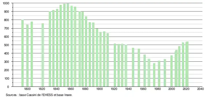 L'évolution du nombre d'habitants est connue à travers les recensements de la population effectués dans la commune depuis 1793. Pour les communes de moins de 10 000 habitants, une enquête de recensement portant sur toute la population est réalisée tous les cinq ans, les populations légales des années intermédiaires étant quant à elles estimées par interpolation ou extrapolation[45]. Pour la commune, le premier recensement exhaustif entrant dans le cadre du nouveau dispositif a été réalisé en 2005[46].