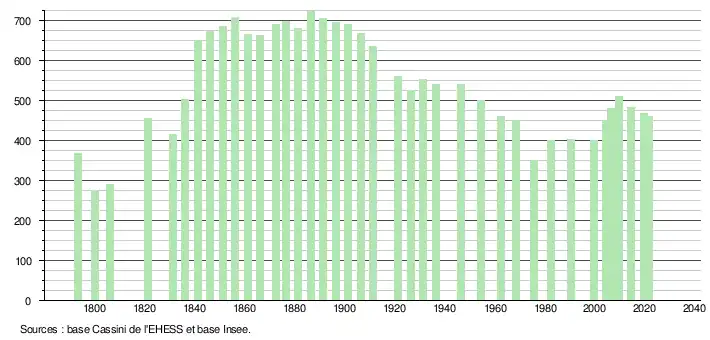La population a atteint son apogée en 1886 avec 724 habitants et son minimum en 1800 avec 276 habitants.