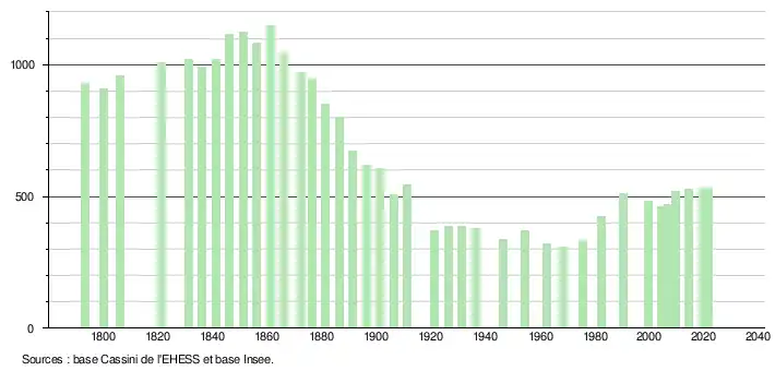 L'évolution du nombre d'habitants est connue à travers les recensements de la population effectués dans la commune depuis 1793. Pour les communes de moins de 10 000 habitants, une enquête de recensement portant sur toute la population est réalisée tous les cinq ans, les populations légales des années intermédiaires étant quant à elles estimées par interpolation ou extrapolation[23]. Pour la commune, le premier recensement exhaustif entrant dans le cadre du nouveau dispositif a été réalisé en 2004[24].