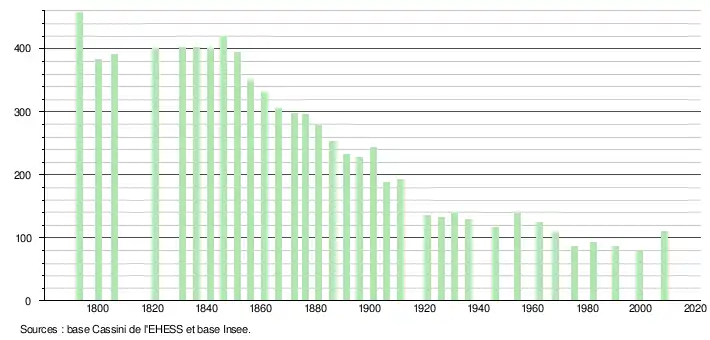 - Dans le tableau des recensements et le graphique, par convention dans Wikipédia, le principe a été retenu, pour les populations légales postérieures à 1999 de n’afficher dans le tableau des recensements et le graphique que les populations correspondant à l'année 2006, première population légale publiée calculée conformément aux concepts définis dans le décret no 2003-485 du 5 juin 2003, et les années correspondant à une enquête exhaustive de recensement pour les communes de moins de 10 000 habitants, ainsi que la dernière population légale publiée par l’Insee.