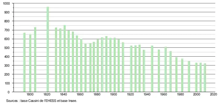 L'évolution du nombre d'habitants est connue à travers les recensements de la population effectués dans la commune depuis 1793. À partir du , les populations légales des communes sont publiées annuellement dans le cadre d'un recensement qui repose désormais sur une collecte d'information annuelle, concernant successivement tous les territoires communaux au cours d'une période de cinq ans. Pour les communes de moins de 10 000 habitants, une enquête de recensement portant sur toute la population est réalisée tous les cinq ans, les populations légales des années intermédiaires étant quant à elles estimées par interpolation ou extrapolation[9]. Pour la commune, le premier recensement exhaustif entrant dans le cadre du nouveau dispositif a été réalisé en 2004[10],[Note 2].