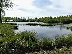 Quelques ruisseaux affluents intermittents descendent des plateaux environnants. Des étangs issus d'anciennes tourbières sont visibles au nord-est[2].