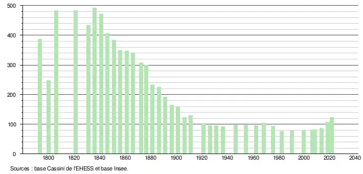 L'évolution du nombre d'habitants est connue à travers les recensements de la population effectués dans la commune depuis 1793. Pour les communes de moins de 10 000 habitants, une enquête de recensement portant sur toute la population est réalisée tous les cinq ans, les populations légales des années intermédiaires étant quant à elles estimées par interpolation ou extrapolation[20]. Pour la commune, le premier recensement exhaustif entrant dans le cadre du nouveau dispositif a été réalisé en 2008[21].