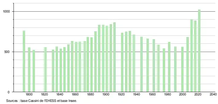 L'évolution du nombre d'habitants est connue à travers les recensements de la population effectués dans la commune depuis 1793. Pour les communes de moins de 10 000 habitants, une enquête de recensement portant sur toute la population est réalisée tous les cinq ans, les populations légales des années intermédiaires étant quant à elles estimées par interpolation ou extrapolation[21]. Pour la commune, le premier recensement exhaustif entrant dans le cadre du nouveau dispositif a été réalisé en 2006[22].