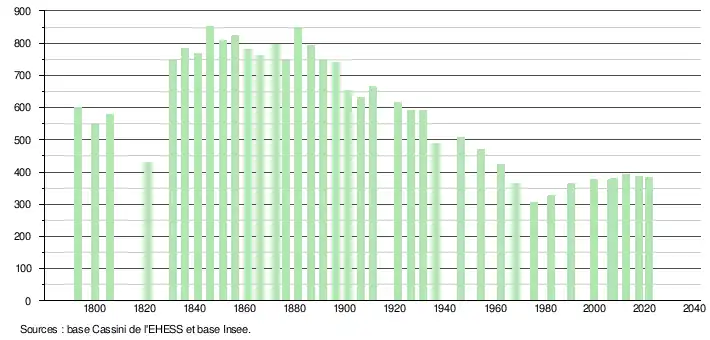 L'évolution du nombre d'habitants est connue à travers les recensements de la population effectués dans la commune depuis 1793. Pour les communes de moins de 10 000 habitants, une enquête de recensement portant sur toute la population est réalisée tous les cinq ans, les populations légales des années intermédiaires étant quant à elles estimées par interpolation ou extrapolation[21]. Pour la commune, le premier recensement exhaustif entrant dans le cadre du nouveau dispositif a été réalisé en 2007[22].