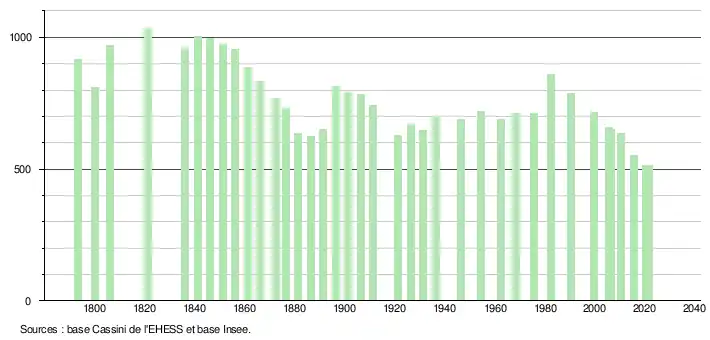 L'évolution du nombre d'habitants est connue à travers les recensements de la population effectués dans la commune depuis 1793. Pour les communes de moins de 10 000 habitants, une enquête de recensement portant sur toute la population est réalisée tous les cinq ans, les populations légales des années intermédiaires étant quant à elles estimées par interpolation ou extrapolation[20]. Pour la commune, le premier recensement exhaustif entrant dans le cadre du nouveau dispositif a été réalisé en 2005[21].