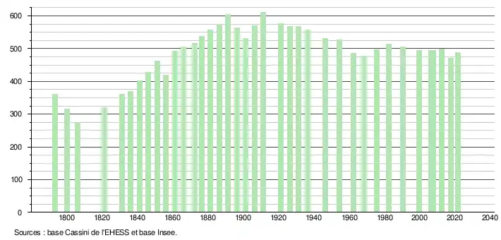 L'évolution du nombre d'habitants est connue à travers les recensements de la population effectués dans la commune depuis 1793. Pour les communes de moins de 10 000 habitants, une enquête de recensement portant sur toute la population est réalisée tous les cinq ans, les populations légales des années intermédiaires étant quant à elles estimées par interpolation ou extrapolation[27]. Pour la commune, le premier recensement exhaustif entrant dans le cadre du nouveau dispositif a été réalisé en 2007[28].