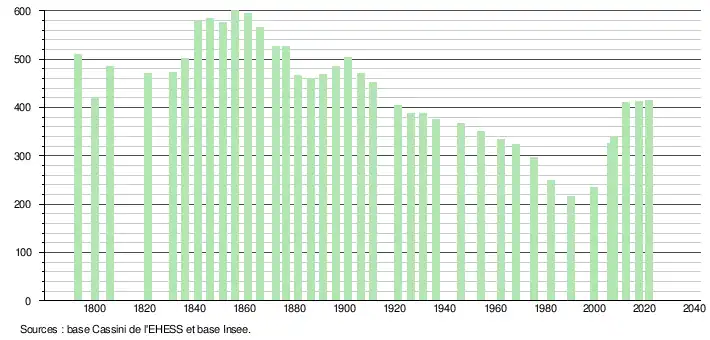 L'évolution du nombre d'habitants est connue à travers les recensements de la population effectués dans la commune depuis 1793. Pour les communes de moins de 10 000 habitants, une enquête de recensement portant sur toute la population est réalisée tous les cinq ans, les populations légales des années intermédiaires étant quant à elles estimées par interpolation ou extrapolation[26]. Pour la commune, le premier recensement exhaustif entrant dans le cadre du nouveau dispositif a été réalisé en 2007[27].