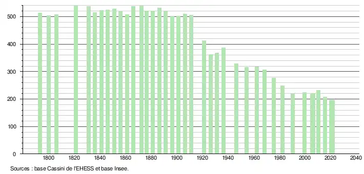 L'évolution du nombre d'habitants est connue à travers les recensements de la population effectués dans la commune depuis 1793. Pour les communes de moins de 10 000 habitants, une enquête de recensement portant sur toute la population est réalisée tous les cinq ans, les populations légales des années intermédiaires étant quant à elles estimées par interpolation ou extrapolation[24]. Pour la commune, le premier recensement exhaustif entrant dans le cadre du nouveau dispositif a été réalisé en 2005[25].