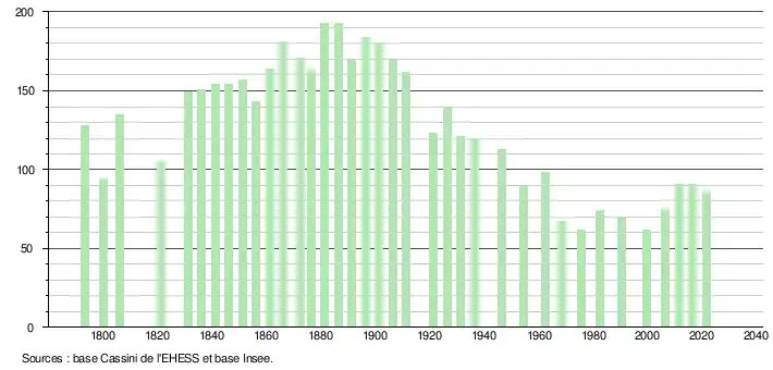 L'évolution du nombre d'habitants est connue à travers les recensements de la population effectués dans la commune depuis 1793. Pour les communes de moins de 10 000 habitants, une enquête de recensement portant sur toute la population est réalisée tous les cinq ans, les populations légales des années intermédiaires étant quant à elles estimées par interpolation ou extrapolation[54]. Pour la commune, le premier recensement exhaustif entrant dans le cadre du nouveau dispositif a été réalisé en 2006[55].