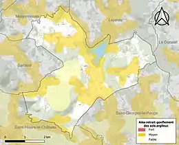 Le retrait-gonflement des sols argileux est susceptible d'engendrer des dommages importants aux bâtiments en cas d’alternance de périodes de sécheresse et de pluie. 39,5 % de la superficie communale est en aléa moyen ou fort (33,6 % au niveau départemental et 48,5 % au niveau national). Sur les 75 bâtiments dénombrés sur la commune en 2019, 16 sont en aléa moyen ou fort, soit 21 %, à comparer aux 25 % au niveau départemental et 54 % au niveau national. Une cartographie de l'exposition du territoire national au retrait gonflement des sols argileux est disponible sur le site du BRGM[16],[Carte 2].