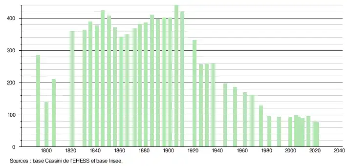 L'évolution du nombre d'habitants est connue à travers les recensements de la population effectués dans la commune depuis 1793. Pour les communes de moins de 10 000 habitants, une enquête de recensement portant sur toute la population est réalisée tous les cinq ans, les populations légales des années intermédiaires étant quant à elles estimées par interpolation ou extrapolation[20]. Pour la commune, le premier recensement exhaustif entrant dans le cadre du nouveau dispositif a été réalisé en 2004[21].